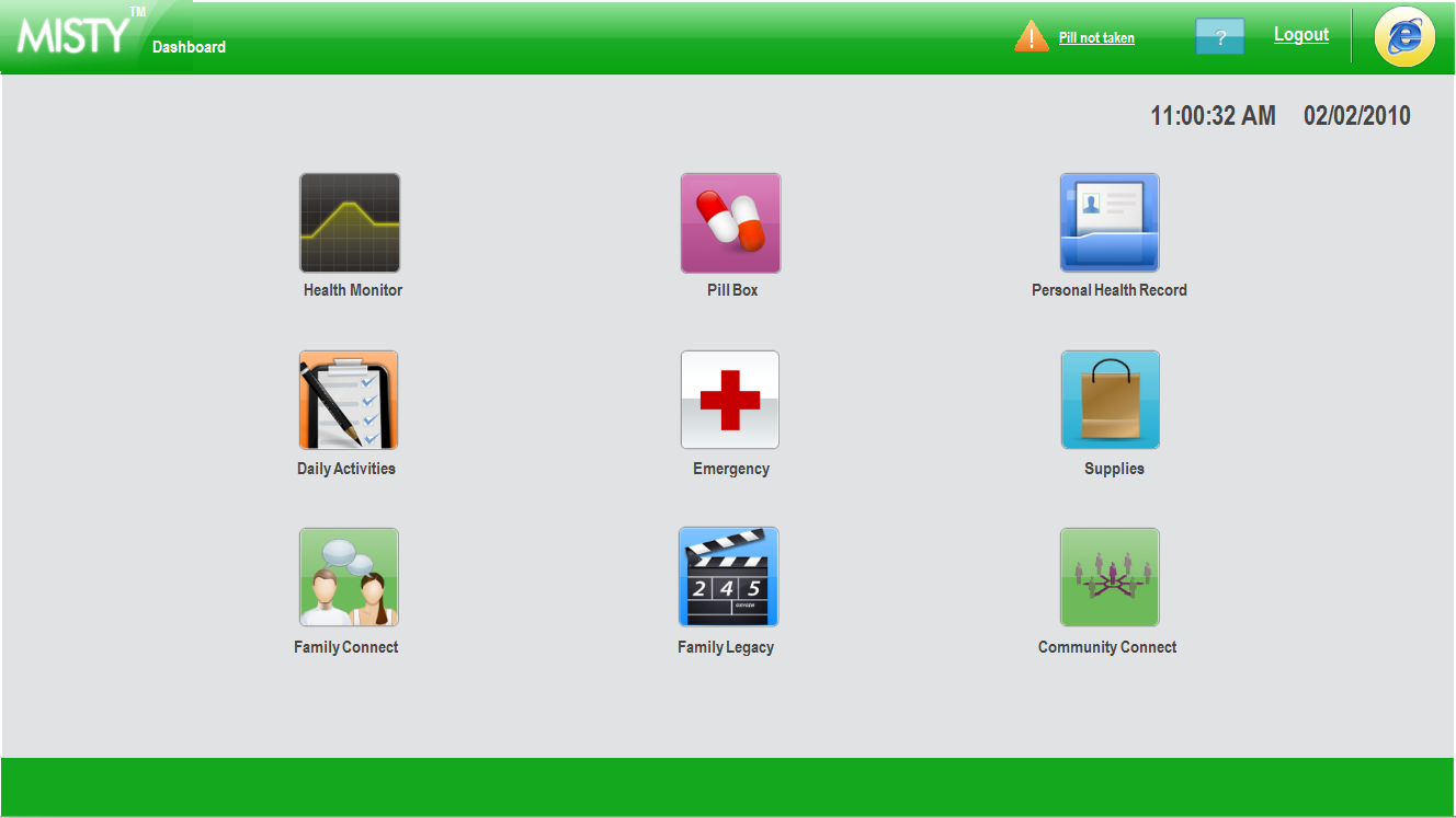 Other features include emergency alerts; a pill box feature to help ensure compliance with medication prescriptions; access to personal health records; ordering and inventorying specific supplies; recording daily activities; and, connections with social services ranging from exercise instruction, and faith-based services, to social groups and partitioned family connections.